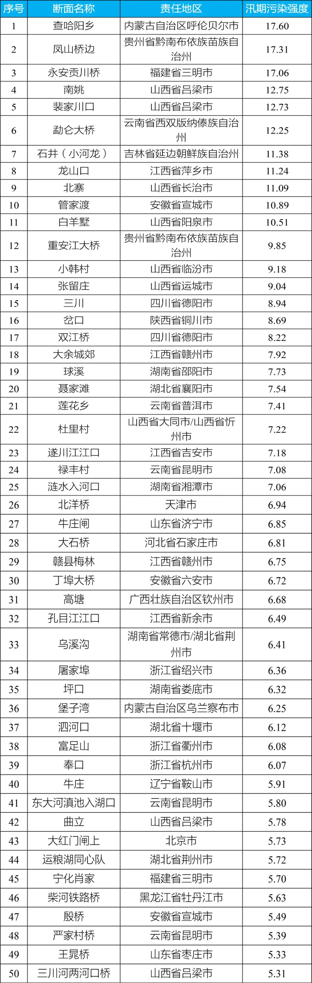 全国汛期污染强度较大的前50名断面分布在20个省份(见附件3),数量较多省份为山西(9个)、江西(5个)、云南(5个)。其中,内蒙古自治区呼伦贝尔市查哈阳乡断面、贵州省黔南布依族苗族自治州凤山桥边断面、福建省三明市永安贡川桥断面汛期污染强度位于全国前三名,分别达到考核目标限值的17.6倍、17.3倍、17.1倍。