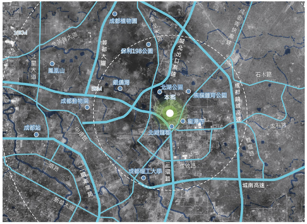項目地塊位於成都市北部,未來成華區的副中心——北湖熊貓國際旅遊休閒區,與成都火車站直線距離8.5公里,距成都東站9.5公里,距北湖客運站0.7公里,距離市中心位置10公里,地理位置優越,交通便利。