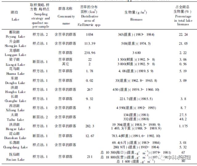 在很多湖泊植被调查工作中都对苦草群落或含苦草的群落生物量进行了测定(见下图)。从表中可以看出,最高和最低生物量之间存在上千倍的差异。这一方面是因为调查对象尚包括其它种类,而非苦草本身; 另一方面,也是由于调查方法本身所致: