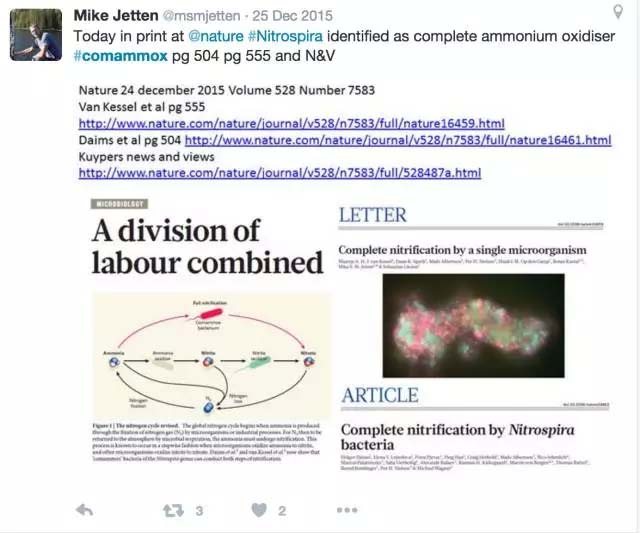 这个理论最先是由俄国微生物界传奇维诺格拉斯基 (Sergei Winogradsky)早在19世纪末“成功”展示,他分离出了负责这两步硝化的微生物,也就是所谓的AOB(ammonia oxidizing bacteria)和NOB(nitrite oxidizing bacteria)。但这个超过100年历史的教条在2015年圣诞节前被英国明星科学杂志《自然》上的两篇同日发表的题目雷同的文章和随后一篇在美国微生物学会的文章终结了。三个科学团队发现了三种不同的培养[1,2]和一种非培养细菌[3]能够各自进行从氨氮到硝态氮的完全硝化过程。