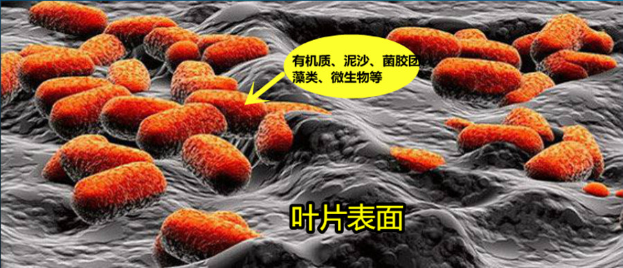 植物顶部叶片上以细菌等微生物为主,而底部则为藻类、细菌等构成的复杂微生物群落结构。