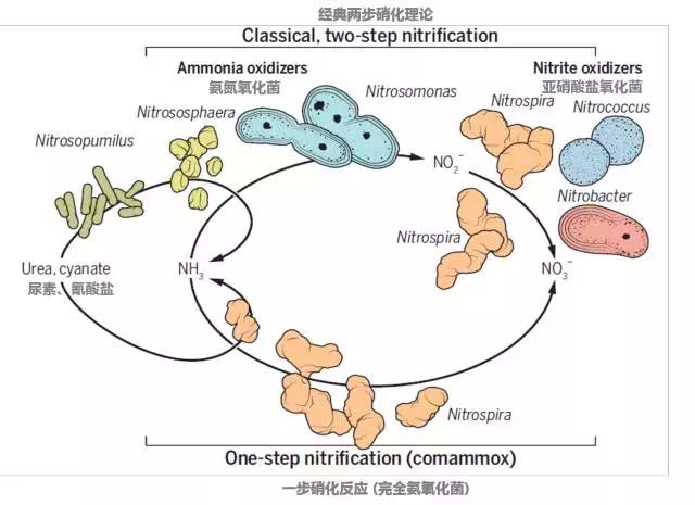 这个理论最先是由俄国微生物界传奇维诺格拉斯基 (Sergei Winogradsky)早在19世纪末“成功”展示,他分离出了负责这两步硝化的微生物,也就是所谓的AOB(ammonia oxidizing bacteria)和NOB(nitrite oxidizing bacteria)。但这个超过100年历史的教条在2015年圣诞节前被英国明星科学杂志《自然》上的两篇同日发表的题目雷同的文章和随后一篇在美国微生物学会的文章终结了。三个科学团队发现了三种不同的培养[1,2]和一种非培养细菌[3]能够各自进行从氨氮到硝态氮的完全硝化过程。