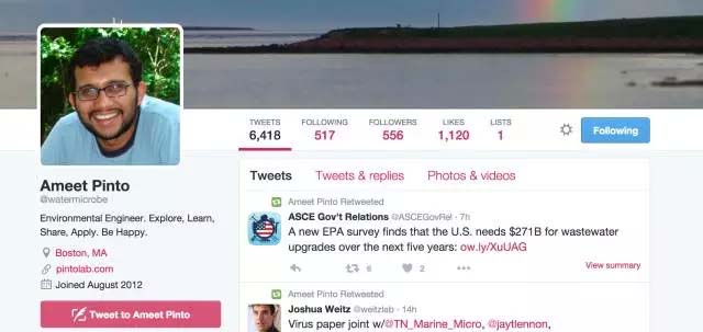 如果你的研究方向和他相似,尽可以跟他联系,他的推特账号是@watermicrobe,email是 a.pinto@neu.edu